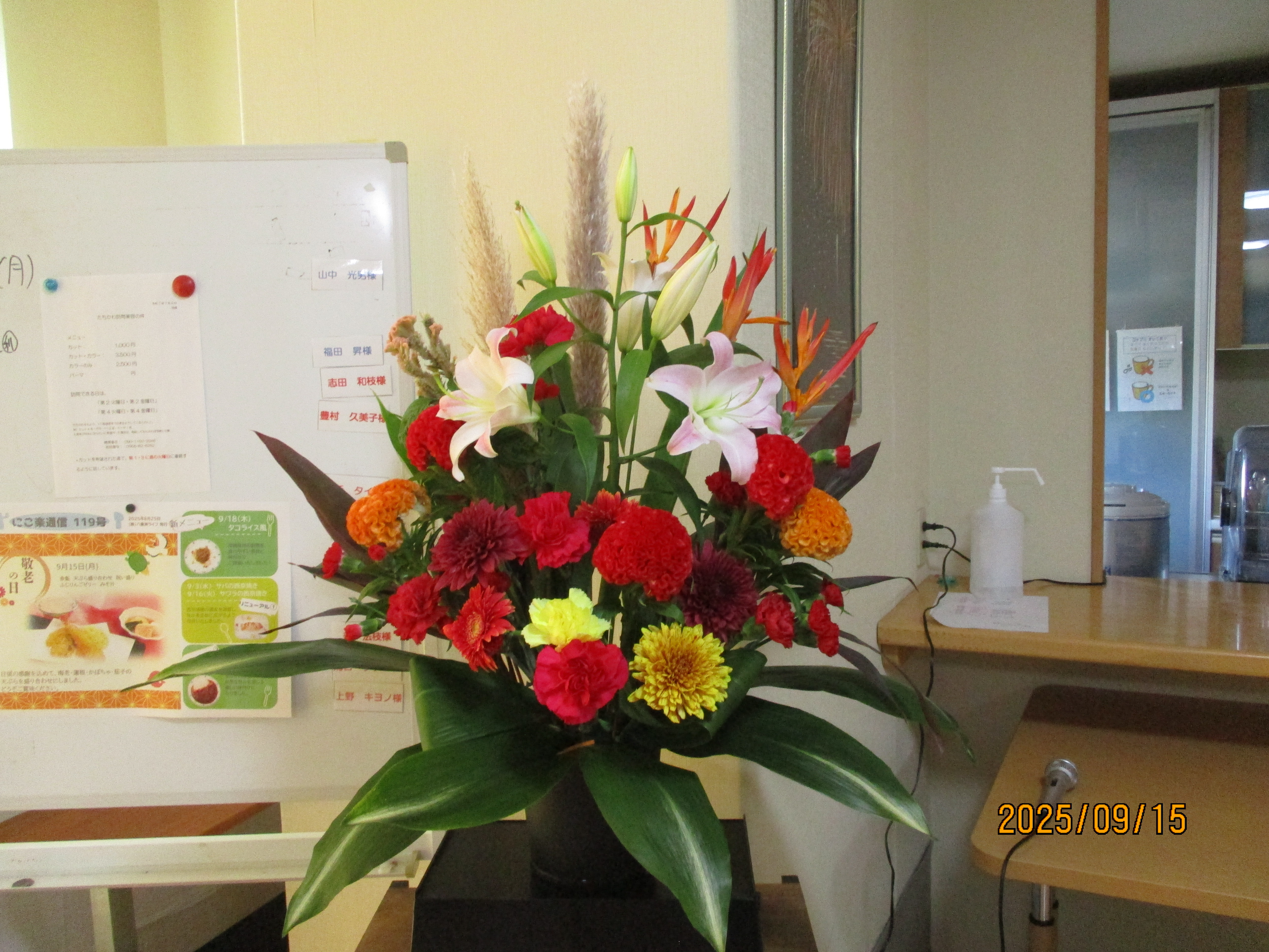 飾り付けも立派に出来上がり、綺麗な花飾りで益々華やかに(*^^*)敬老会らしく出来上がりました